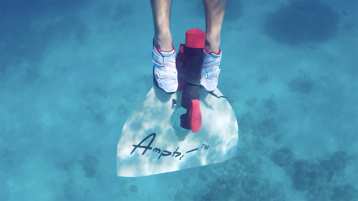 両足を本体に装着するだけと手軽に使用でき、尾ビレのような形状のフィンに搭載した小型エンジンにより、水中をモーターの推進力でパワフルに泳ぐことが可能な「Amphi」。