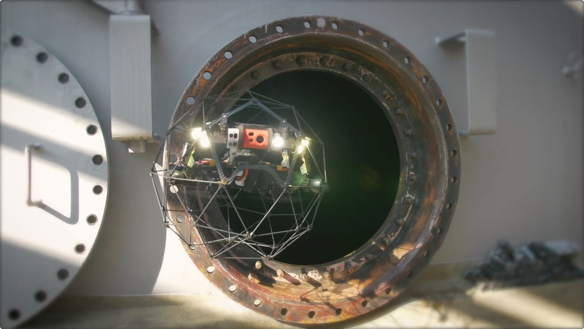 外郭の大きさは直径わずか40cmで、マンホールにもすっぽり入る大きさ。人による探索を必要とせず、外から手軽に操縦しての探索が可能となる。