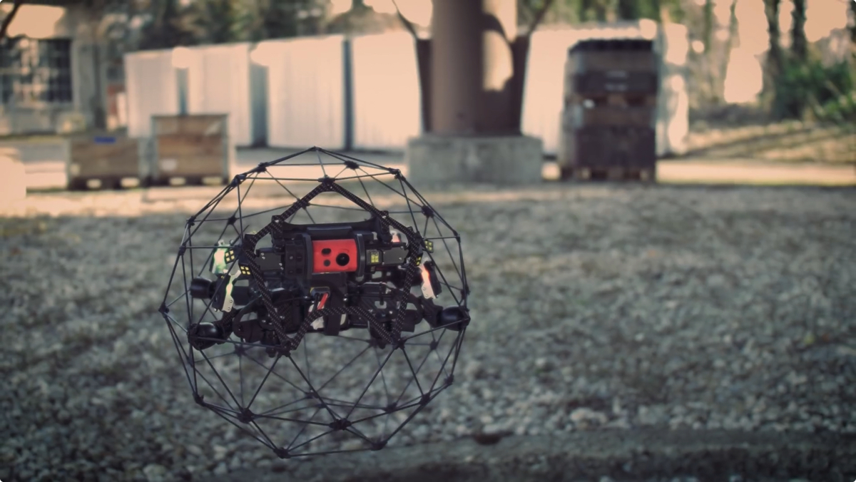 ELIOSシリーズの特徴は、本体への衝突を守る球状の外郭だ。さらに、外郭への衝突も防ぐためプロペラの回転速度と回転方向を自動修正し、安定した飛行を実現している。