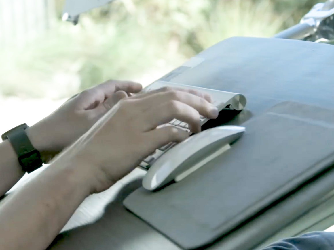 「ALTWORK STATION」のデスクにはマグネットが内蔵されており、寝っ転がった状態でPC作業をしても顔にPCやマウスが落っこちてくる心配がない。