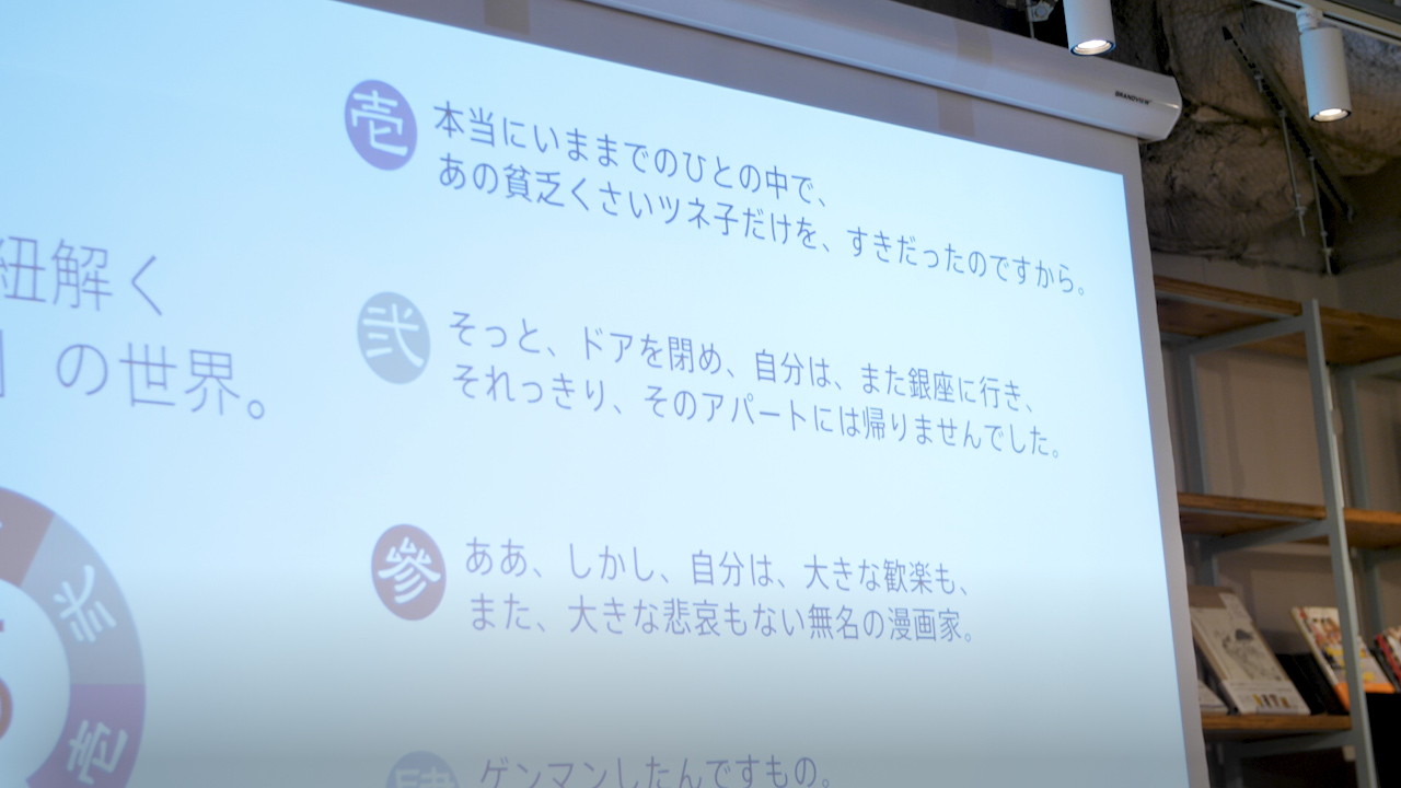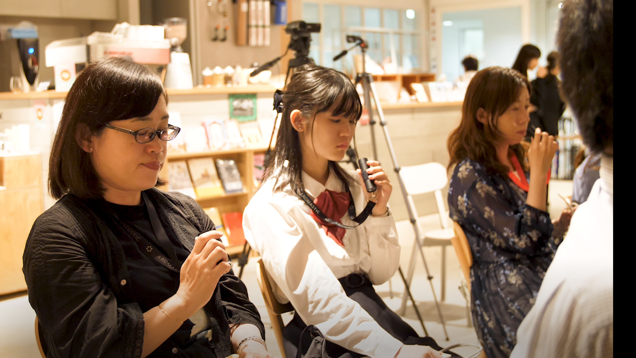 しかし、俳優の萬波 大輔氏を招いて行われた朗読会で、その真価を発揮します。迫真の演技で人間失格の各シーンが朗読され、それだけでもぜいたく。そして該当するカートリッジ番号が会場のスクリーンに表示され、その香りを吸ってみると……