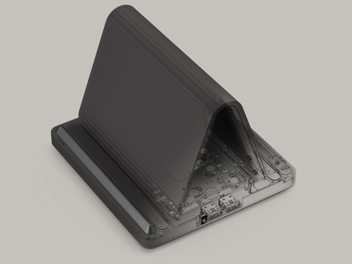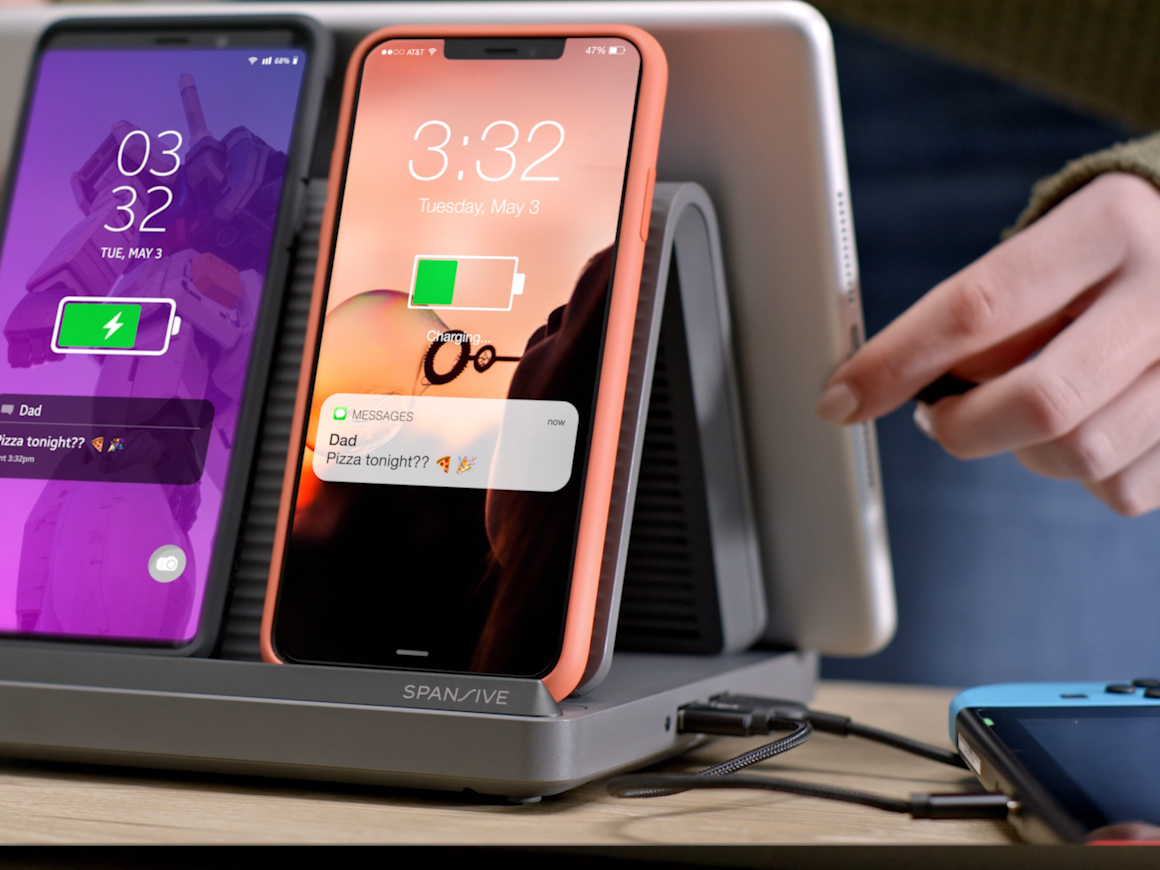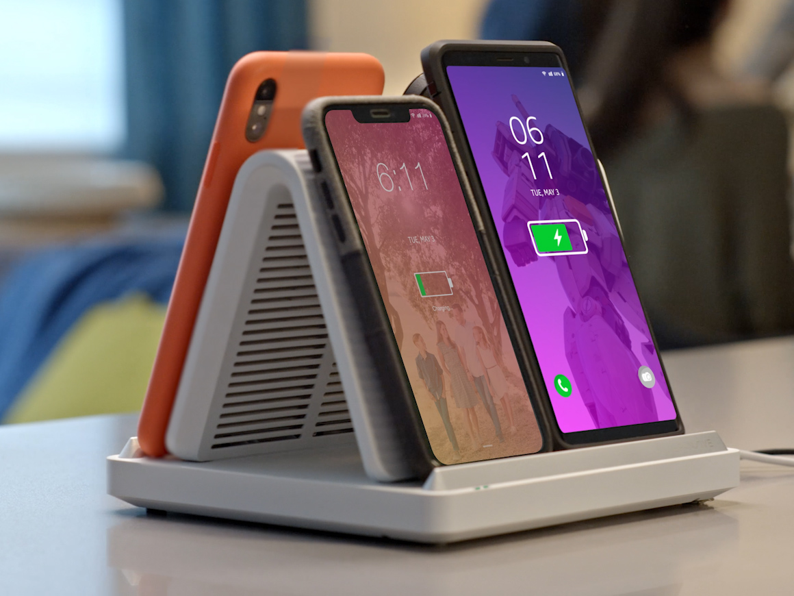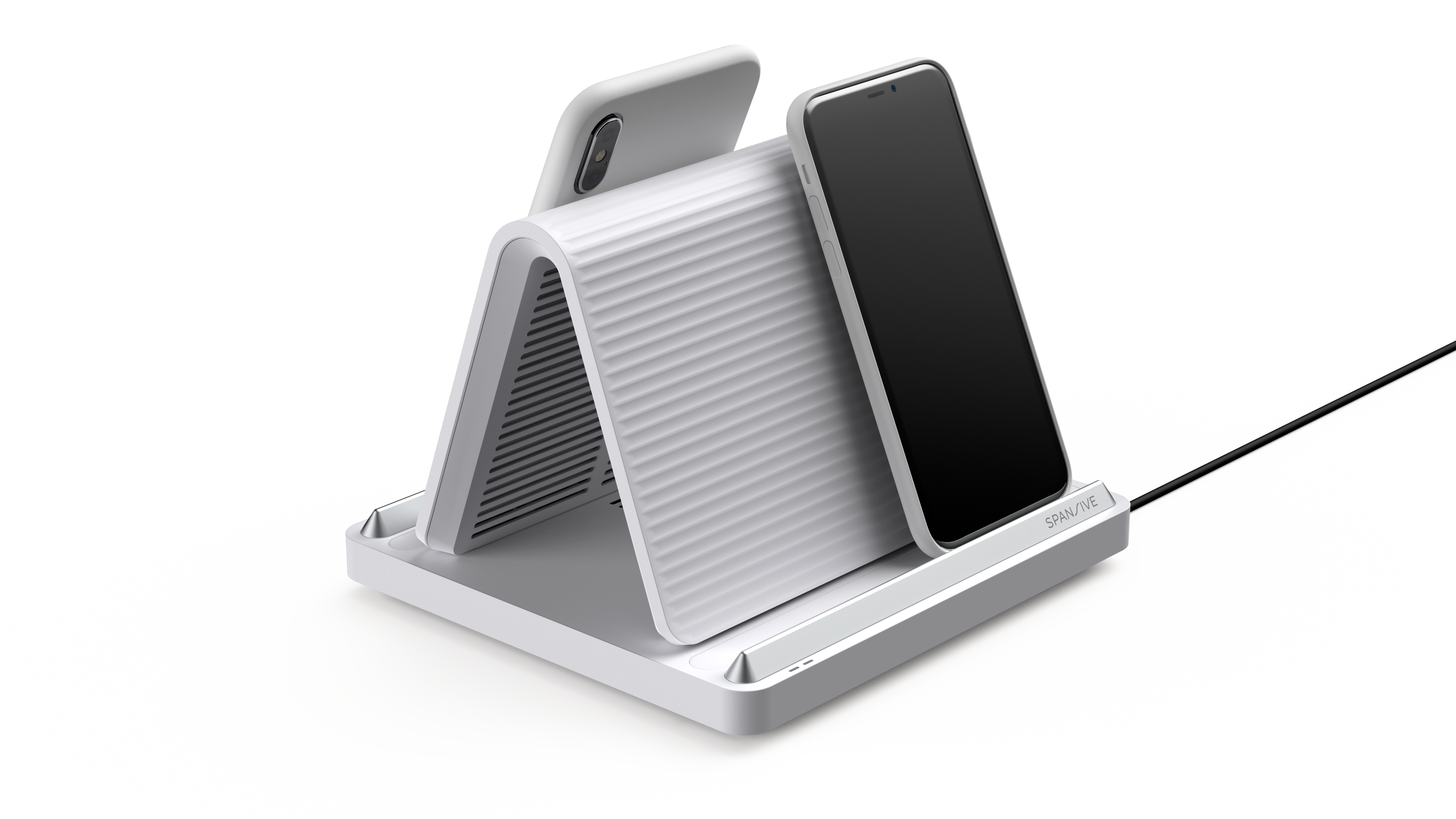Spansive社が開発した「Source」はスマホなど、計6台のデバイスが同時充電可能なプロダクト。4台のワイヤレス充電と2台の有線充電に対応している。