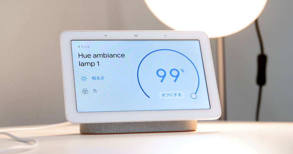 連携しているIoT家電の操作も、スピーカーよりわかりやすくなります。例えばHueのようなスマート電球は、「電気をつけて」でライトがオンになります。同時に画面には照度が「99%」のように表示。続けてタッチ操作か音声操作で調整できるのも、スマートディスプレイならではの使い方です。