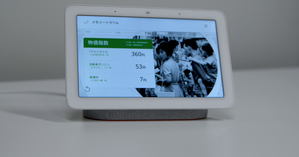 情報量が多くて使いやすい「Nest Hub」。メモリートラベルという機能もディスプレイを活用しています。「メモリートラベル」と声をかけて起動したのち、1950年〜現在までの年代を指定することで、過去へ疑似トリップしたような体験がスタート。