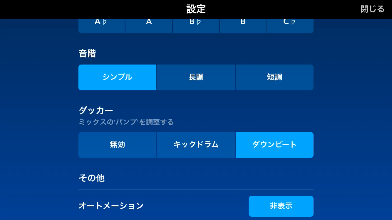 Medlyでは、エフェクトをかけたいクリップをダブルタップして、右上の歯車マークを押すと、”オートメーション”の項目があります。これを「表示」にすると、エフェクトのさまざまなオートメーションを書くことができます。