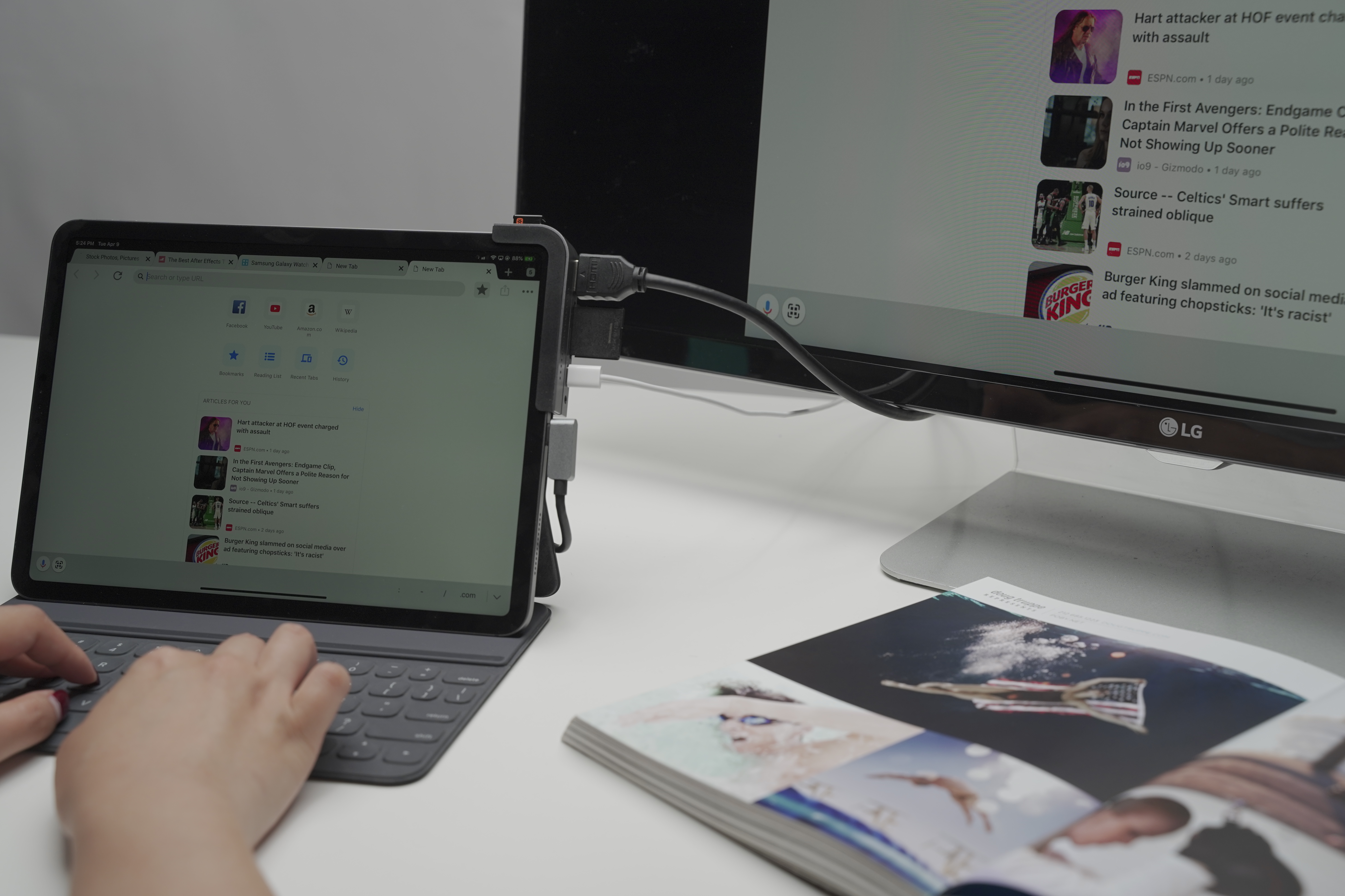 そんな問題を解決してくれるのが、アメリカで開発された6 in 1のUSB-Cハブ「BoltHub」だ。iPadに一体化できるので、スタイリッシュな上に6つの出力と入力に対応してくれる。