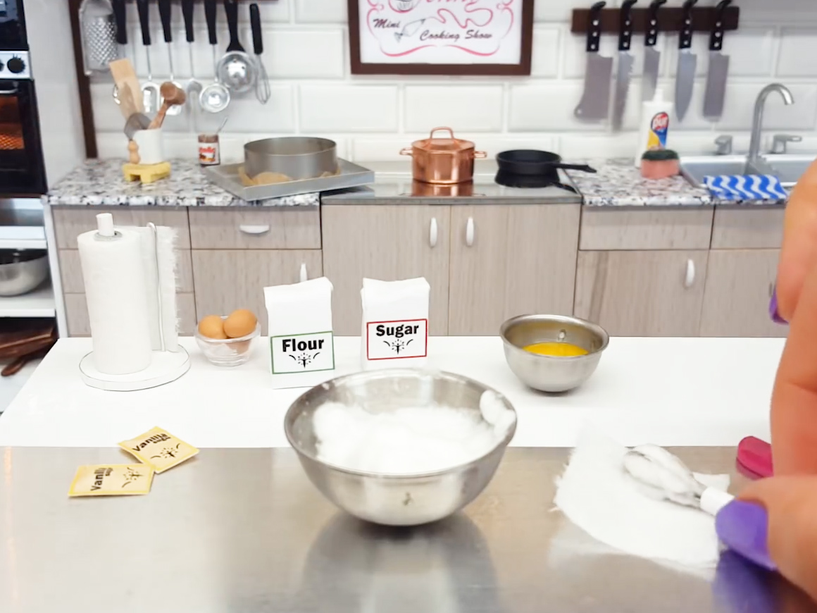 材料をはじめ、ボウル・包丁・ヘラ・キッチンペーパーなどなど、身近なものがミニチュアサイズにされており、異空間に迷い込んだかのような錯覚を楽しめる。