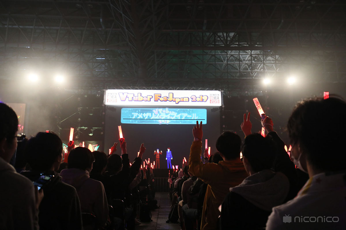 VTuberはブースだけに留まらず「VTuber Fes Japan 2019」と題したトーク、ライブ、バラエティ企画の特設ステージも設けられていました。写真はお笑いコンビ「アメリカザリガニ」のお二人。なんとVTuberとして、超会議に参戦です。アメリカザリガニは定期的にVTuberのキャラクターでも漫才をしており、超会議でもお客さんを盛り上げていました。