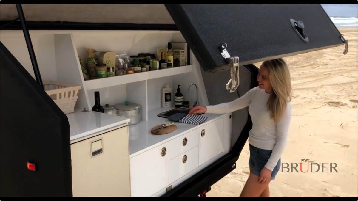 さらに、リアトランクをあけると広々としたキッチンになっている。車体のサイドにはシャワーも搭載されており、開放感のある非日常てきなキャンプ地でも、いつもと変わらぬ環境が手に入れることが可能だ。