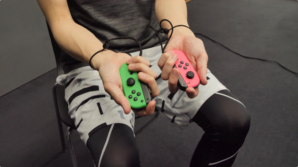 Joy-Conを両手に持てば、Fit Boxingをスタートできます。けっこう激しく動くので、普段ストラップを着けない人も、安心してプレイするには、しっかりストラップを装着し、ロックを閉めておきましょう。