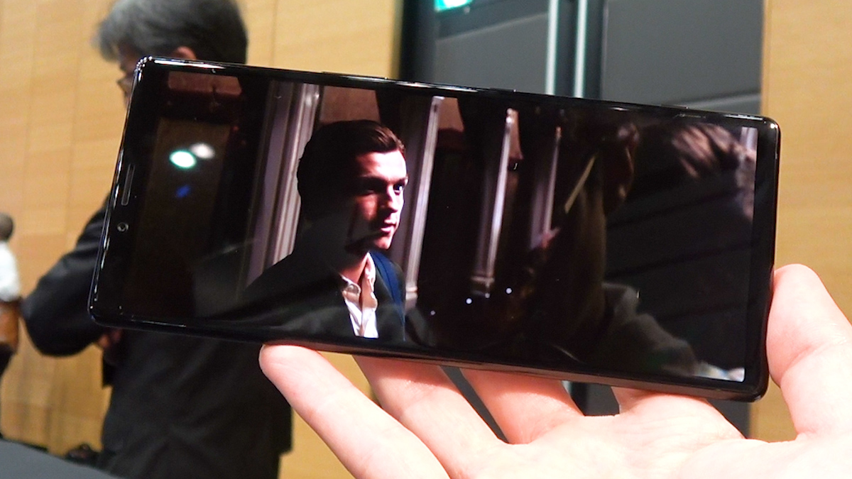 Xperia 1の21:9画面という形状は、大型スマホながら片手持ちにしっくりくるサイズ感。正面右サイドには指紋認証ボタンも搭載しています。