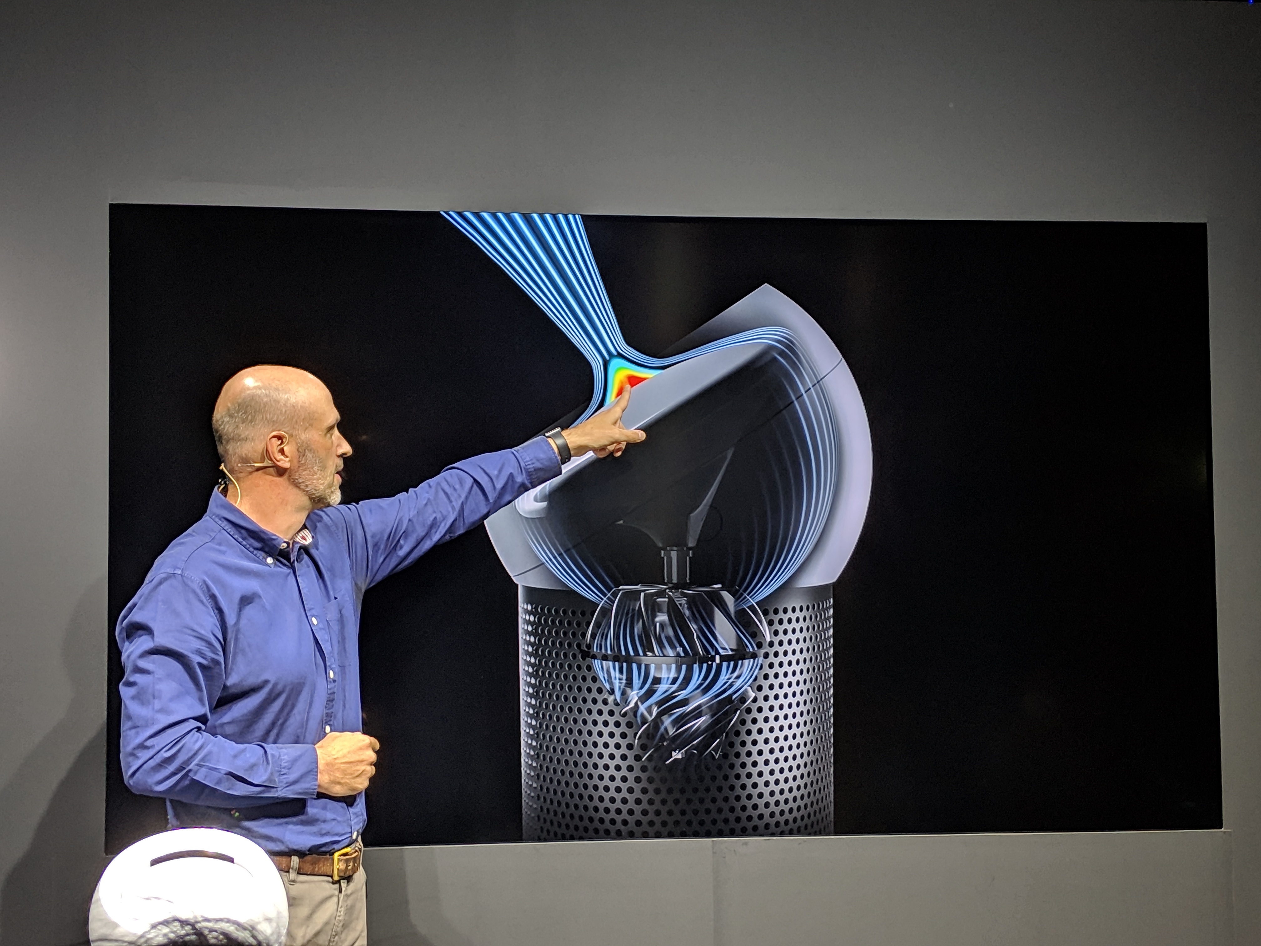 キレイになった空気は、特徴的な形状のドームから排出される。垂直離陸が可能なジェット戦闘機ハリアーにヒントを得て設計された「Dyson Core Flow」によって、フィルターを通った空気が2つに分かれたあとに、凸状のドームに沿って合流。