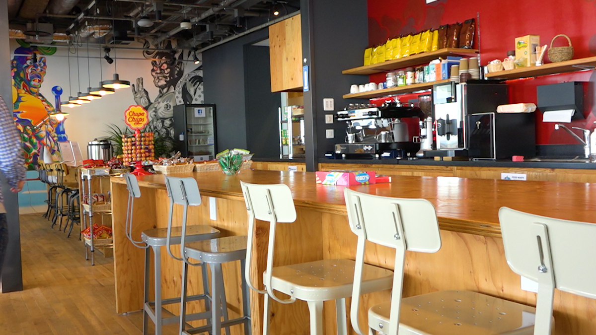 共有スペースには品揃えばっちりのドリンク冷蔵庫があり、マイクロキッチンにはちょっとした軽食や、サラダ、その日のスープなども配置されています。ドリンク冷蔵庫には日本酒の一升瓶(!)まであり、仕事終わりに一杯飲みながら雑談することもあるそうです。