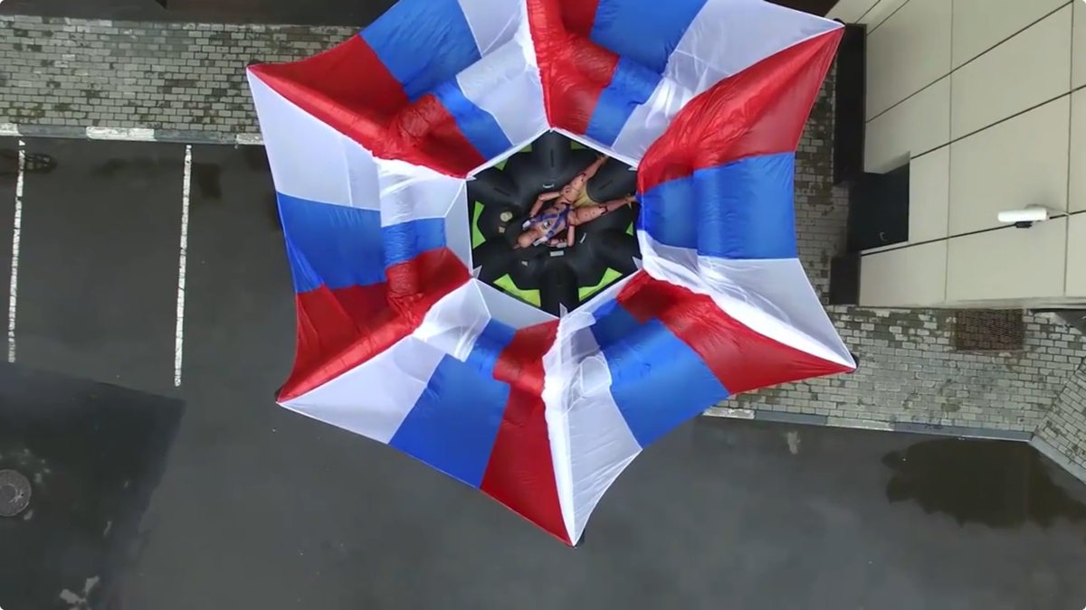 ビル火災などで高層ビルに取り残されても、安全に脱出できるパラシュート「SPARS®」。パラシュートの経験がなくても、誰でも安全に脱出できる頼れるアイテムだ。