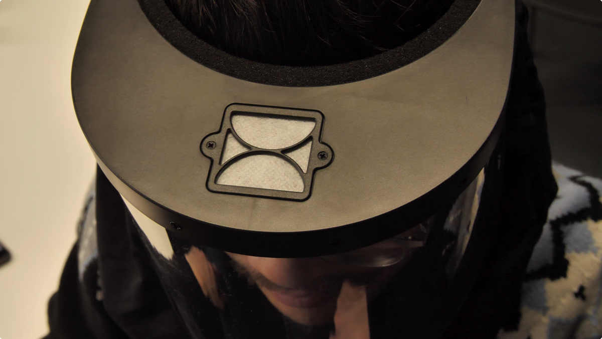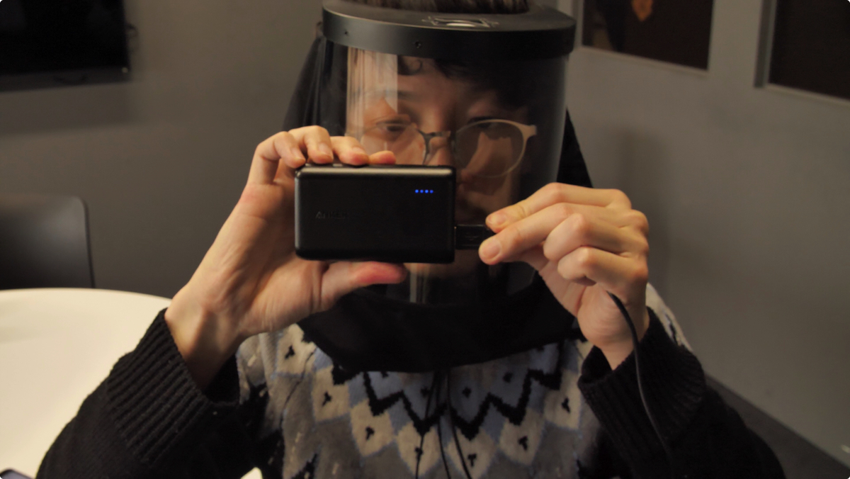 頭部と首元はゴムでサイズ調整できますが、そんなに密封してしまうと息苦しくなるはず。しかし、おでこの部分にファンを搭載。付属のUSBケーブルをモバイルバッテリーなどにつなぐと、ファンが稼働します。三重のフィルターを通したきれいな外気を、内部に送り込んでくれるので安心です。