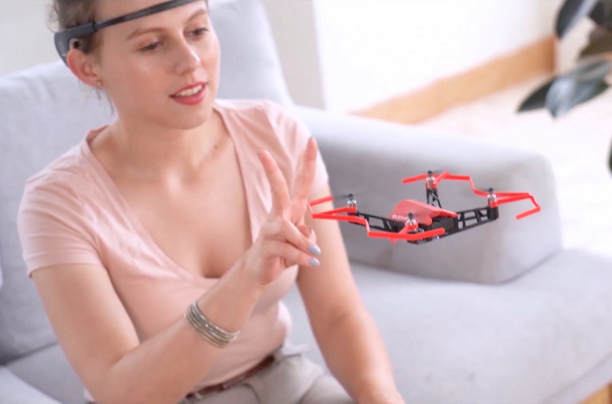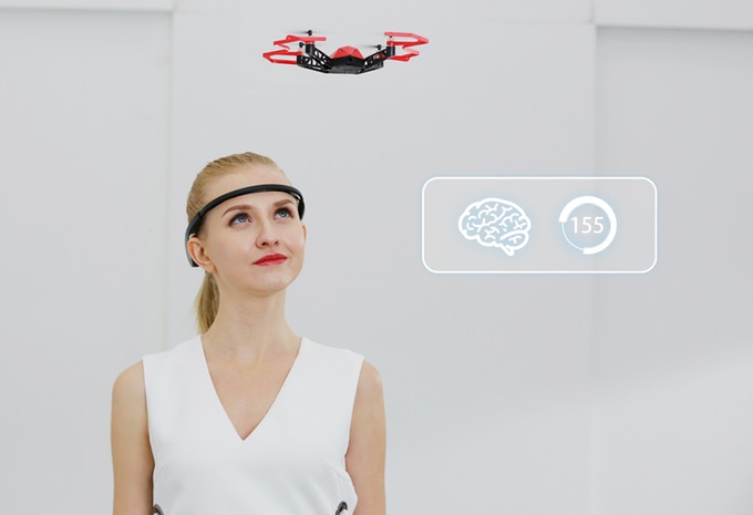 離陸を脳内でイメージすればドローン飛び立ち、方向転換や高度調整も脳内でイメージするだけとのこと。