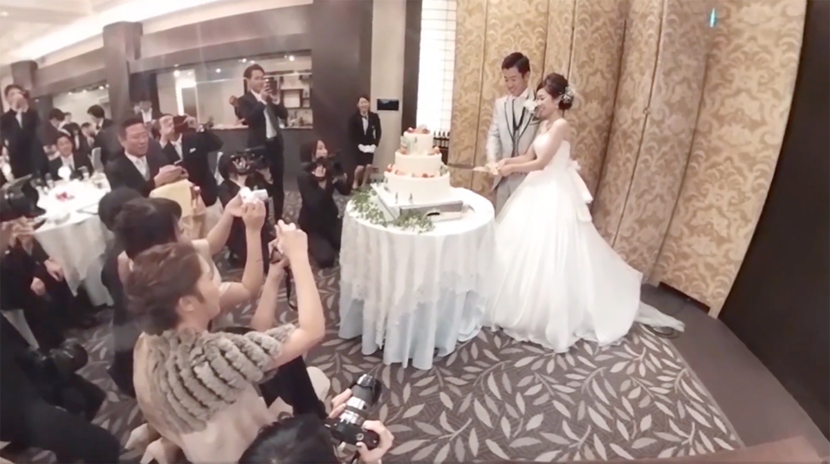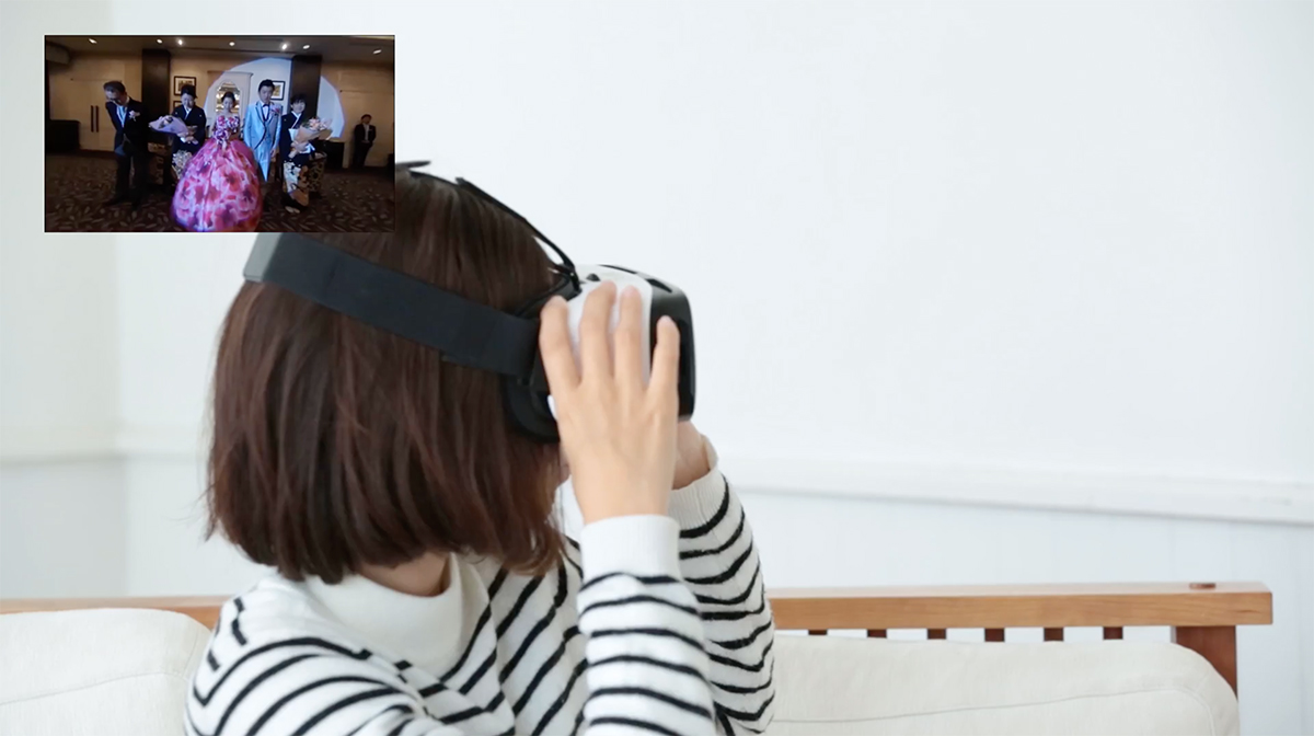 「HUG WEDDING」では、挙式・披露宴の空間を360°カメラで隅々まで記録・生配信し、事情により参加できない人も遠隔地からVRヘッドセットを通して、まるでその場にいるかのような感覚を味わえる。