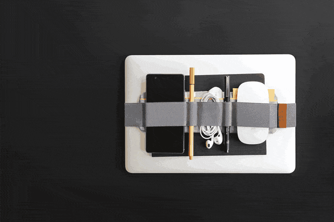 革の部分にはマグネットが内蔵されているため、ノートPCに巻き付けた際に、イヤフォンなどをくっつけておくことが可能。PCに内蔵されたカメラを塞いでおくこともできる。
