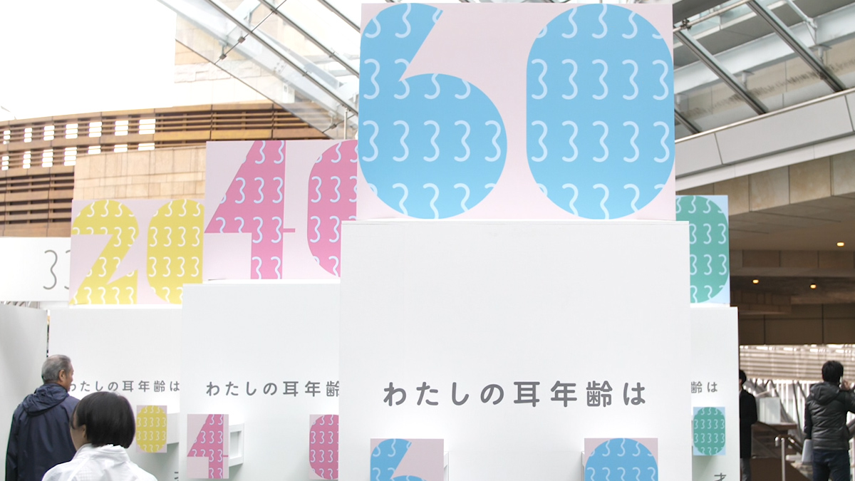 「33(みみ)展」の会場で最初に目に入るのは、8種類のフォトジェニックなオブジェ。自分の耳年齢をチェックできるコンテンツです。