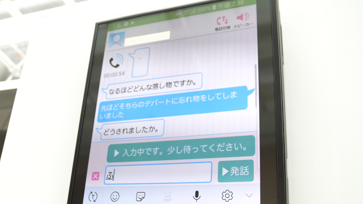 「みえる電話」は、「リアルタイムで話し声をテキストに変換」「テキストを打つと合成音声で読み上げ」を行うアプリ。ブースでは落とし物センターの係員になり、耳が聞こえない人からの問い合わせに「みえる電話」で対応します。