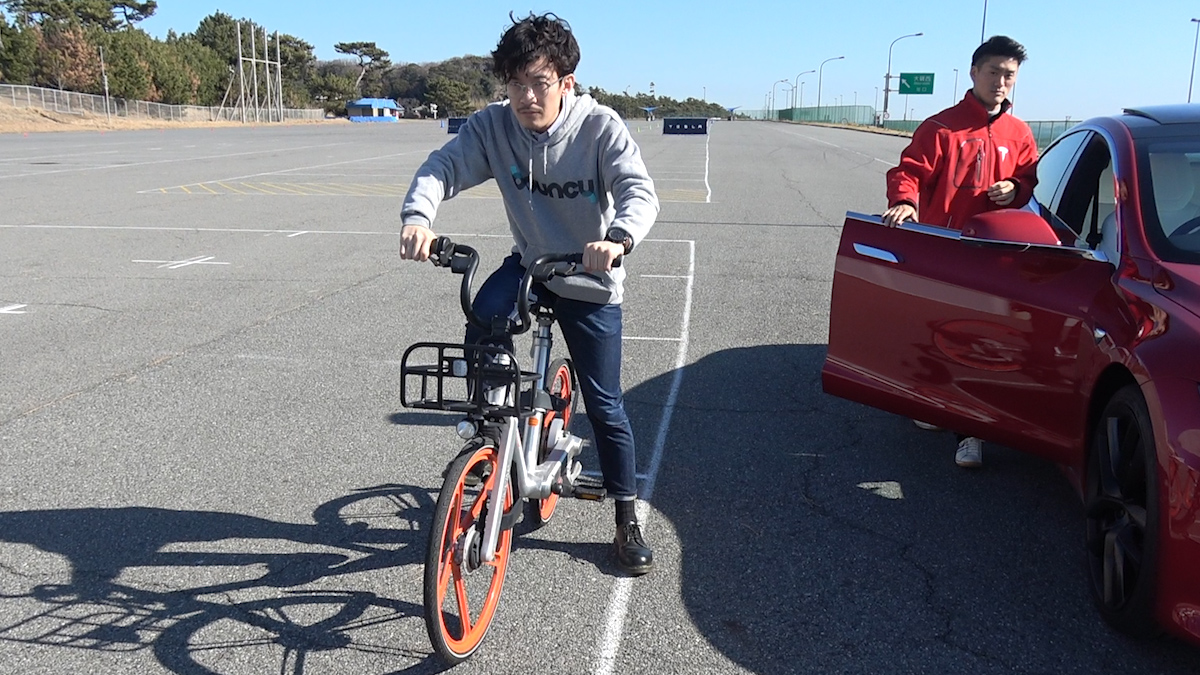 その後、P100Dの圧倒的速度がわかる動画を撮影するべく、「自転車 vs Model S P100D」のレースに挑戦。思いがけず、ちょっとした人だかりもできましたが、予想通りまったく勝負にならず。