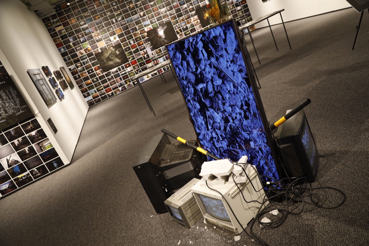 会場の中心には、いくつものディスプレイが積み上げられた彫刻のような立体作品がそびえている。