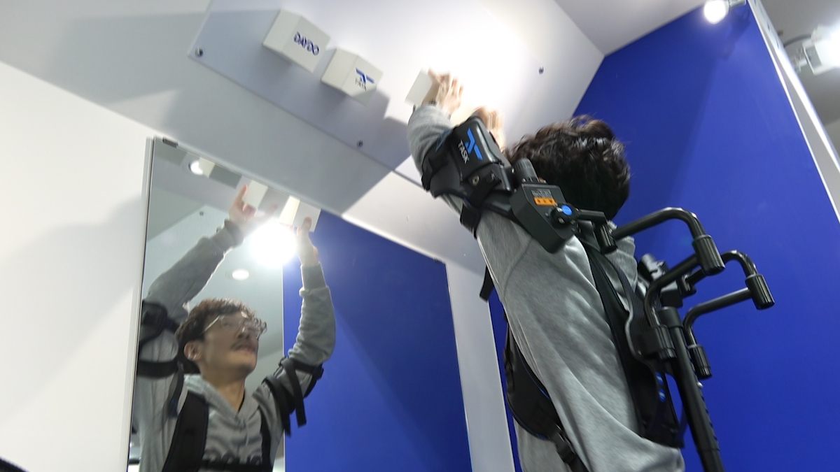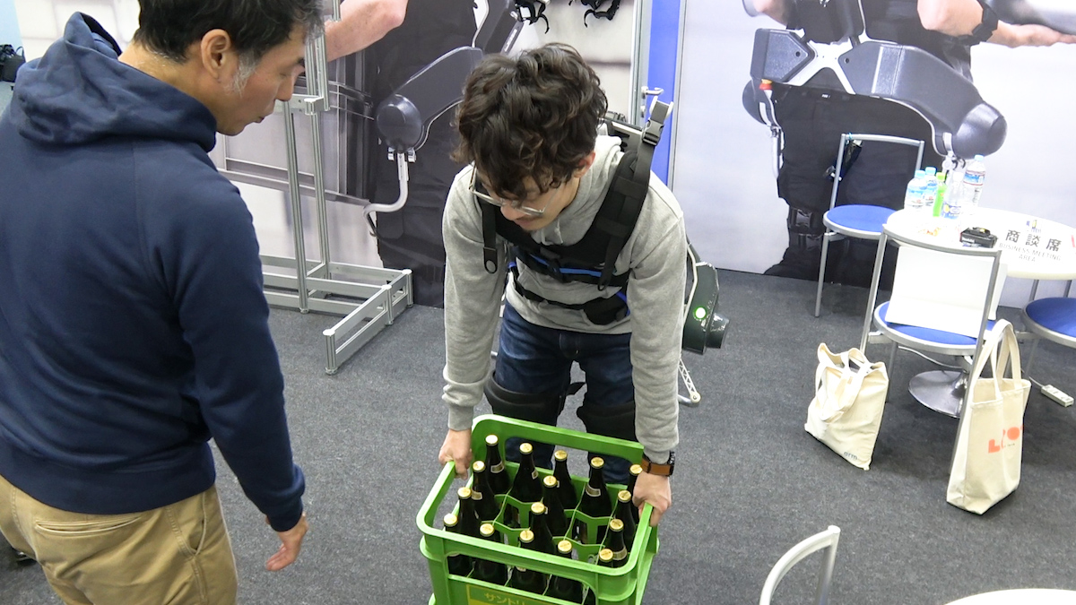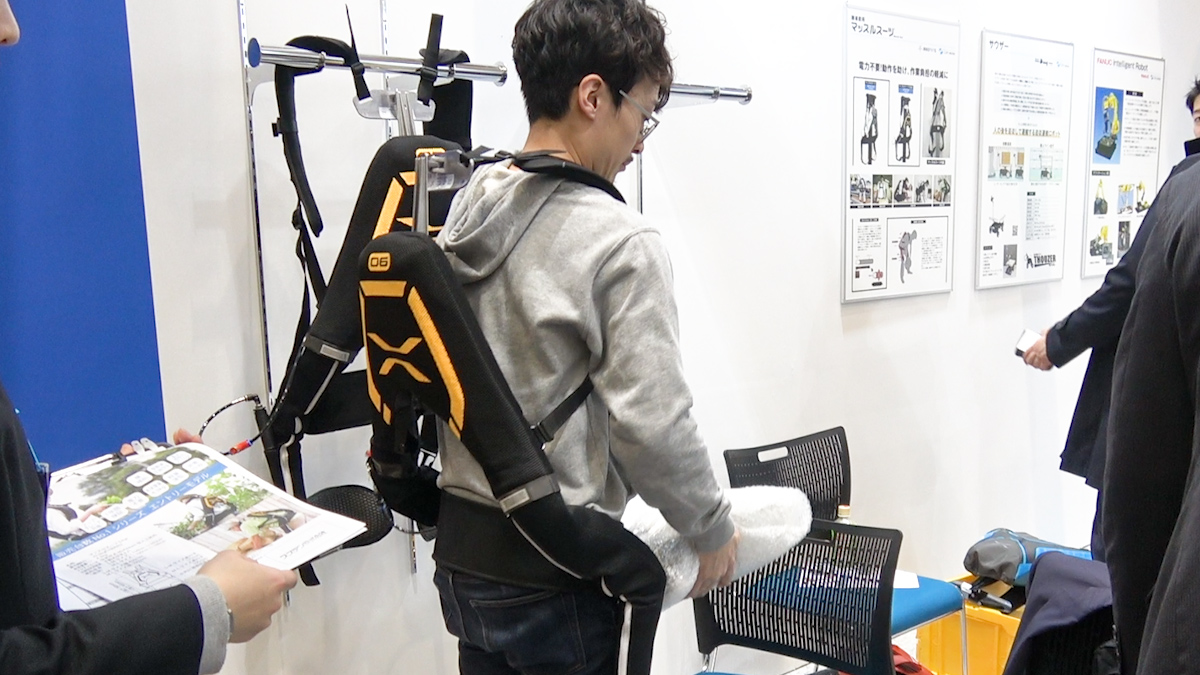 会場のあちこちでは、力仕事の負担を軽減する「パワーアシストスーツ」を展示。腰痛持ちの筆者が未来のお仕事を体験してみました。
