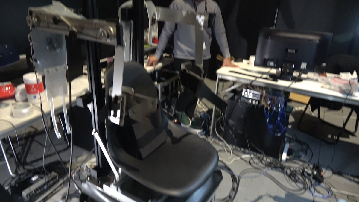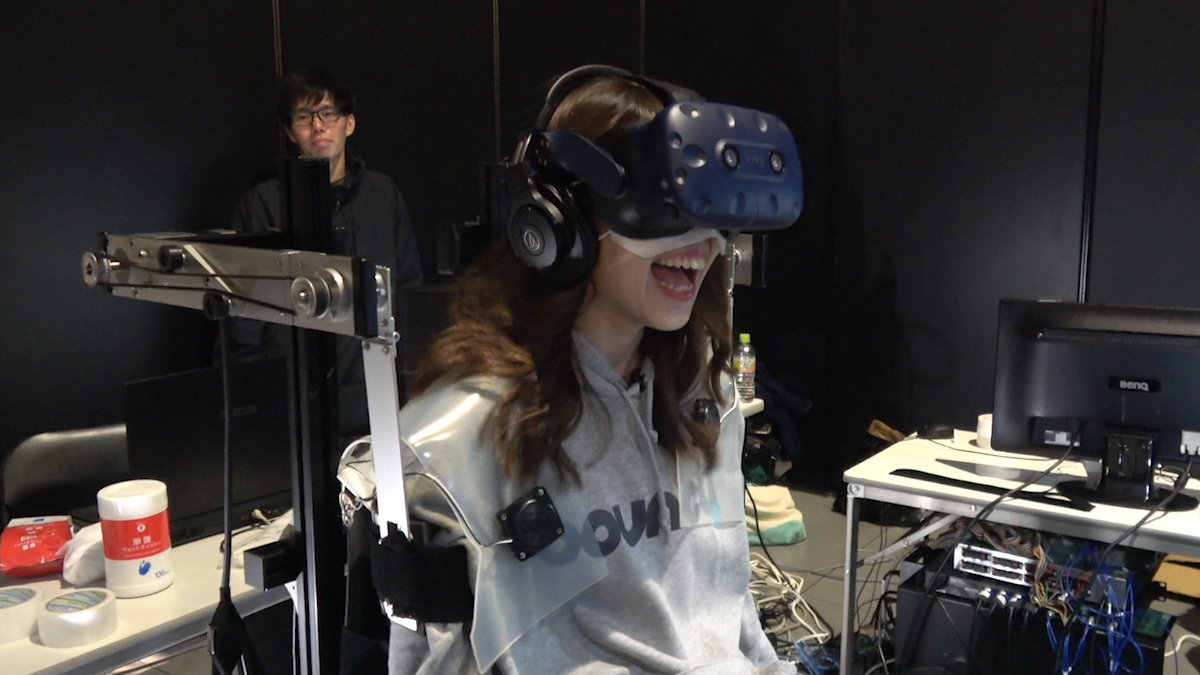 そして、実際に歩いている感覚を与えるため手足に専用の装置を装着。肩には、衣類の感覚を与えるための透明なシートがかけられ、VRゴーグルとヘッドフォンを装着したら準備完了。