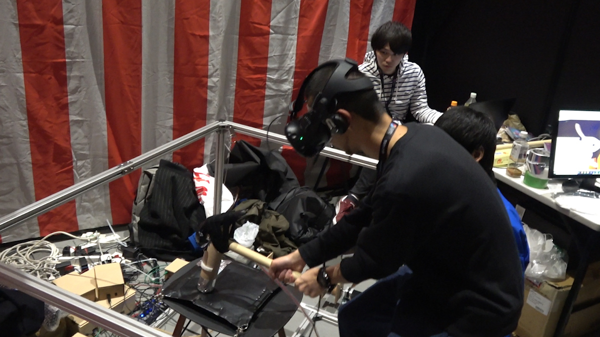 名城大学理工学部情報工学科が開発した「VR餅つき」は、その名の通り餅つきが体験出来るもの。餅をついた後に杵にくっついて伸びる感覚を磁石により再現し、水をつけるとくっつかなくなる様子も再現。