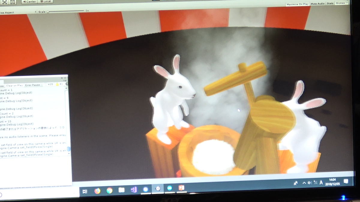なぜ「VR餅つき」を開発したのか聞いたところ、「ノロウイルスとかの影響で餅つき自体が不衛生だと言われ、餅つき自体が減ってきていると聞いて、それなら再現して見ようと思いました」とのこと。何にでも理由がある。
