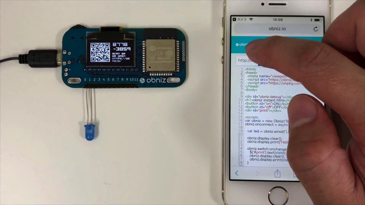 Wi-Fiで接続することでインターネット(API)経由であらゆる言語・環境から簡単に、ハードウェアプログラムや高度なIoTデバイスを製作できる仕組み。スマートフォンで、obnizに表示されたQRコードをスキャンするとプログラムページへアクセスできるので、HTMLの中のjavascriptだけで、すべてプログラムできてしまう。