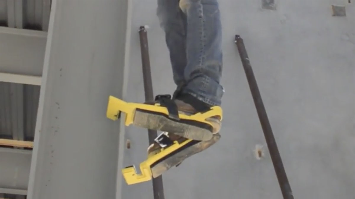 つま先の内側を鉄骨の縁に挟んで引っかける構造で、両足をスライドさせながらスイスイ登ることが可能となる。