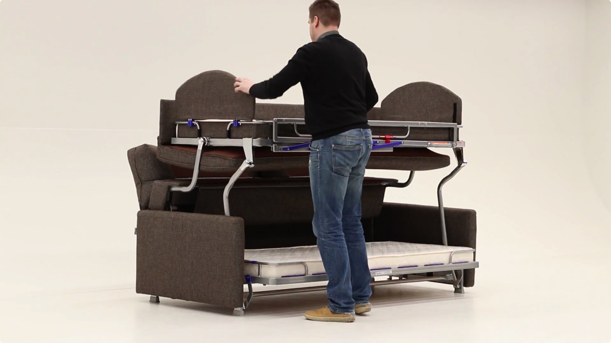 日中は快適にくつろげて、夜はサッと寝床に変身する新しい2段タイプのソファーベッド「Elevate Bunk Bed Sofa Sleeper」。急な複数人の来客にも、すぐ寝床を提供できるユニークな家具だ。
