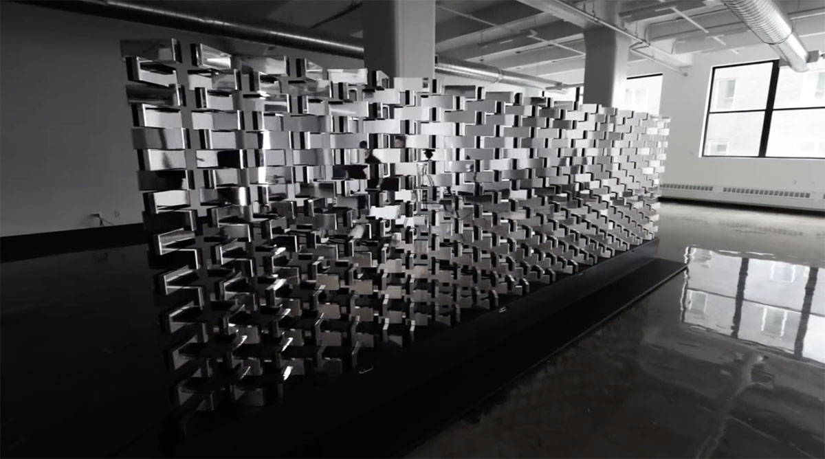 表が鏡、裏が黒塗りのブロックの中心に円筒形の穴を空け、計540個ものブロックを支柱を通して連ねることで高さ1.8m 幅5.8mの壁を形成した「Brixel Mirror」。