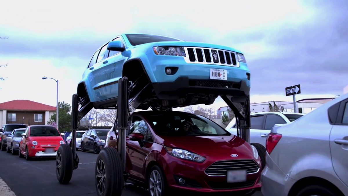 車高が見上げるほどの高さになり、他の車両を跨いで渋滞もおかまいなしでスイスイ進める。車体の下に4台のカメラが搭載されているので、跨ぐ車に接触するというアクシデントも防げる。