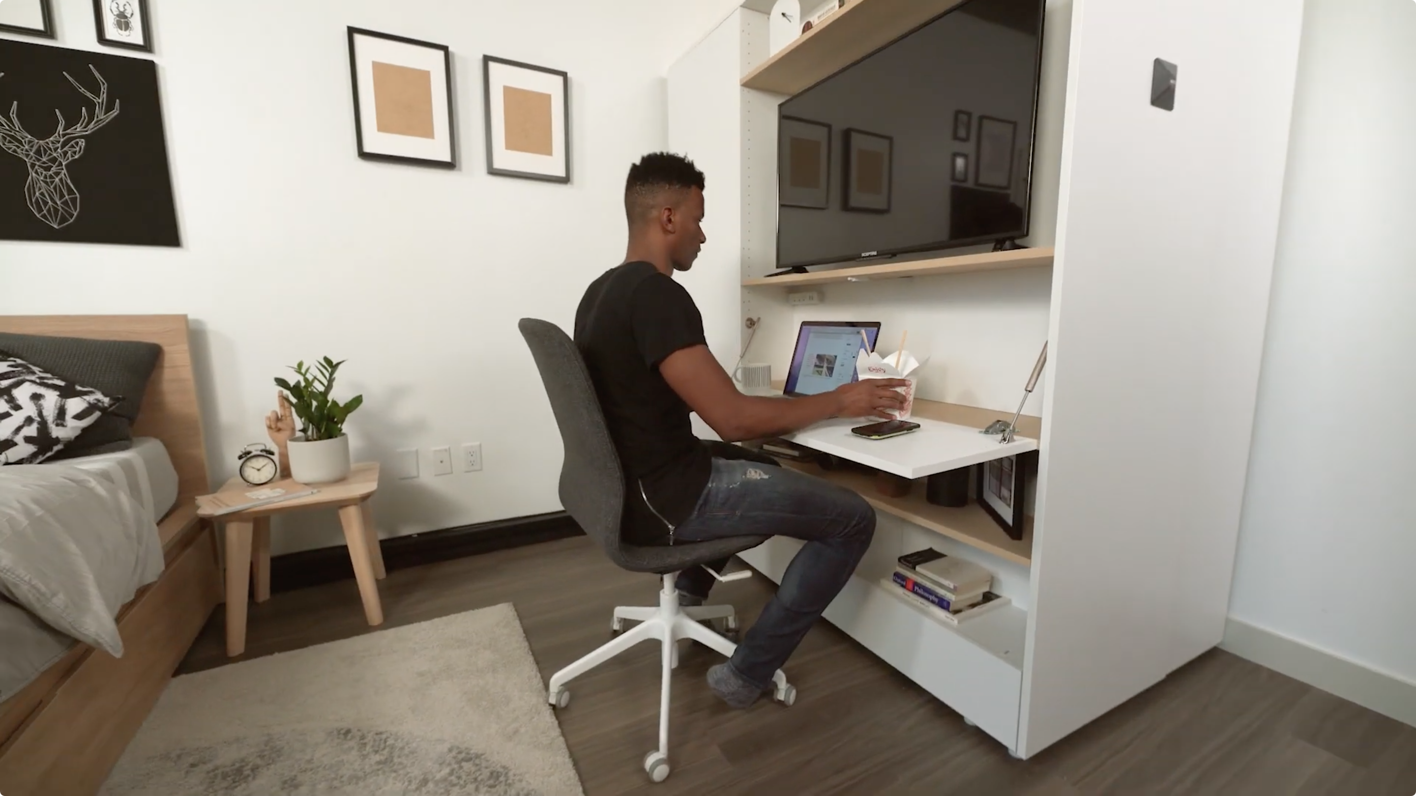 「Ori Pocket Closet」はクローゼットとしての役割だけではなく、閉じた状態だとデスクや棚など他の方法にも活用できるのだ。これだけあれば余分なものを置く必要がなく、広くスペースを確保できるだろう。