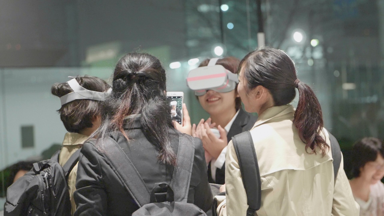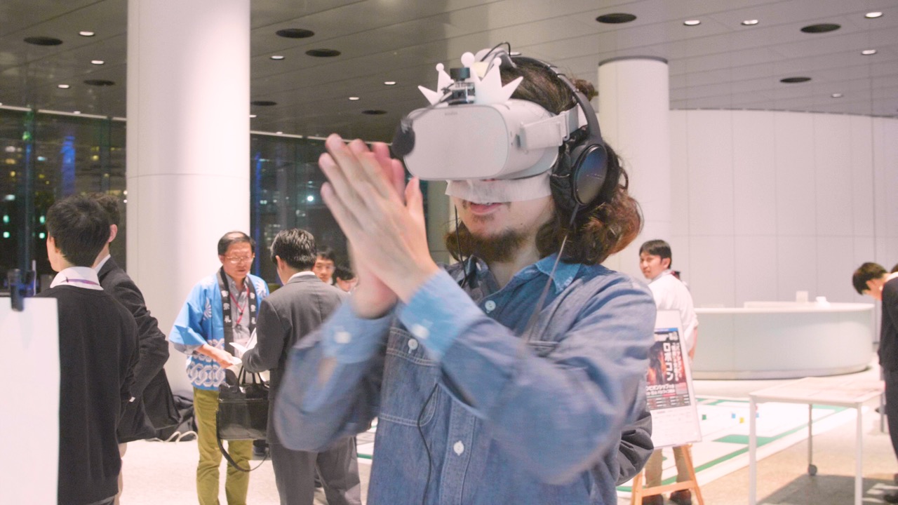 VRゴーグルをつけて体験者が拍手をすると、拍手の音を録音して、ヘッドフォンで増幅。前後左右から拍手喝采を浴びられるという、承認欲求を十二分に満たしてくれるデバイスだ。