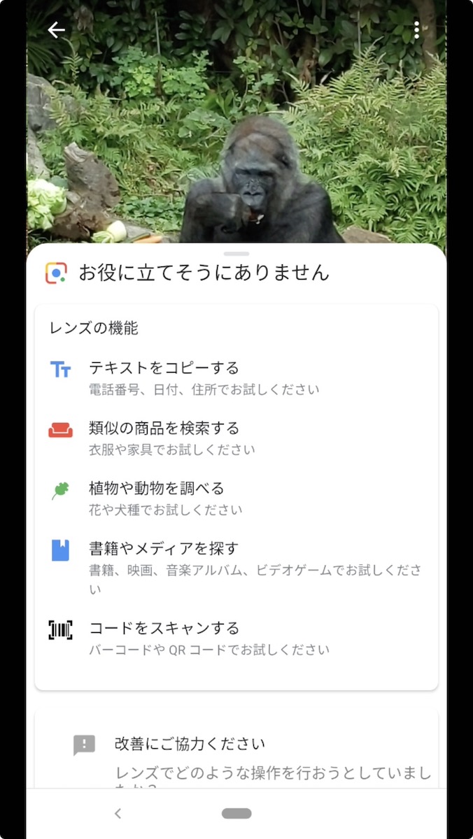 カメラを起動して「レンズ」を選ぶだけで、写した情報をスキャンしてあらゆる情報にアクセス。何ができるかというと、レンズ使う時には「テキスト」「類似商品の検索」「動植物を調べる」「書籍やメディアの検索」「バーコードやQRコードのスキャン」が可能と表示されます。