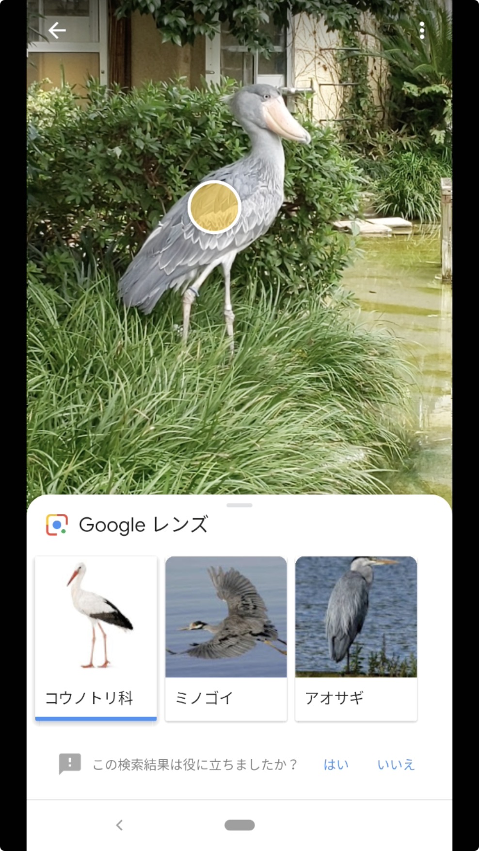 ハシビロコウ先生がいたのでスキャンしてみると……残念ながら形の似た違う鳥類を提案されてしまいました。今後Googleレンズユーザーが増えるほどに、機械学習が進んで精度も上がっていくものと思われます。