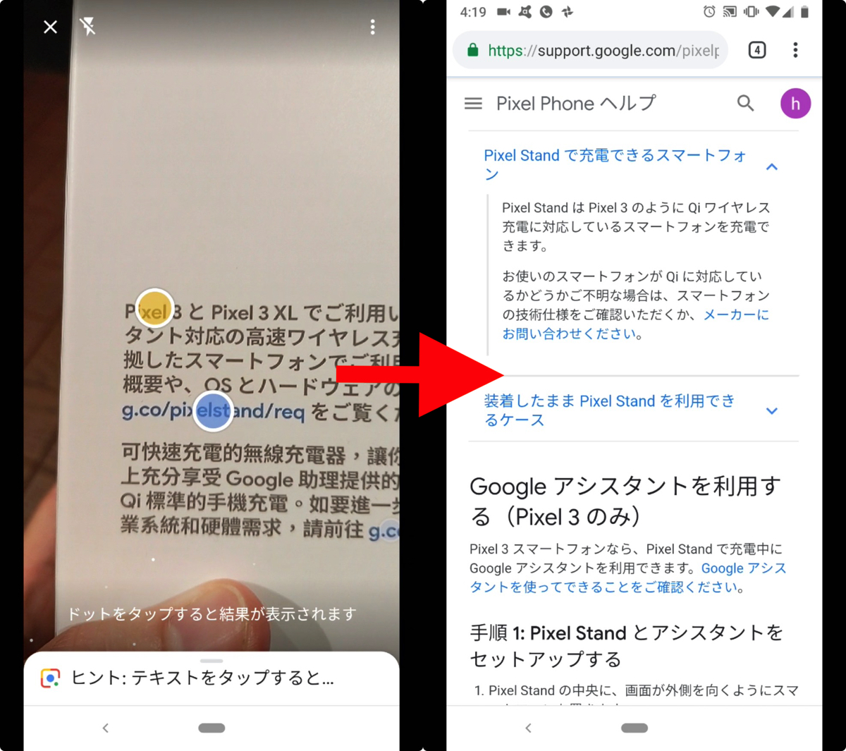 他にも、専用のワイヤレススタンド「Pixel Stand」の箱には、FAQページへのリンクが書かれているのですが、紙に書かれたテキストでも、カメラをかざすだけでアクセスできました。地味に便利だなぁ、コレ。