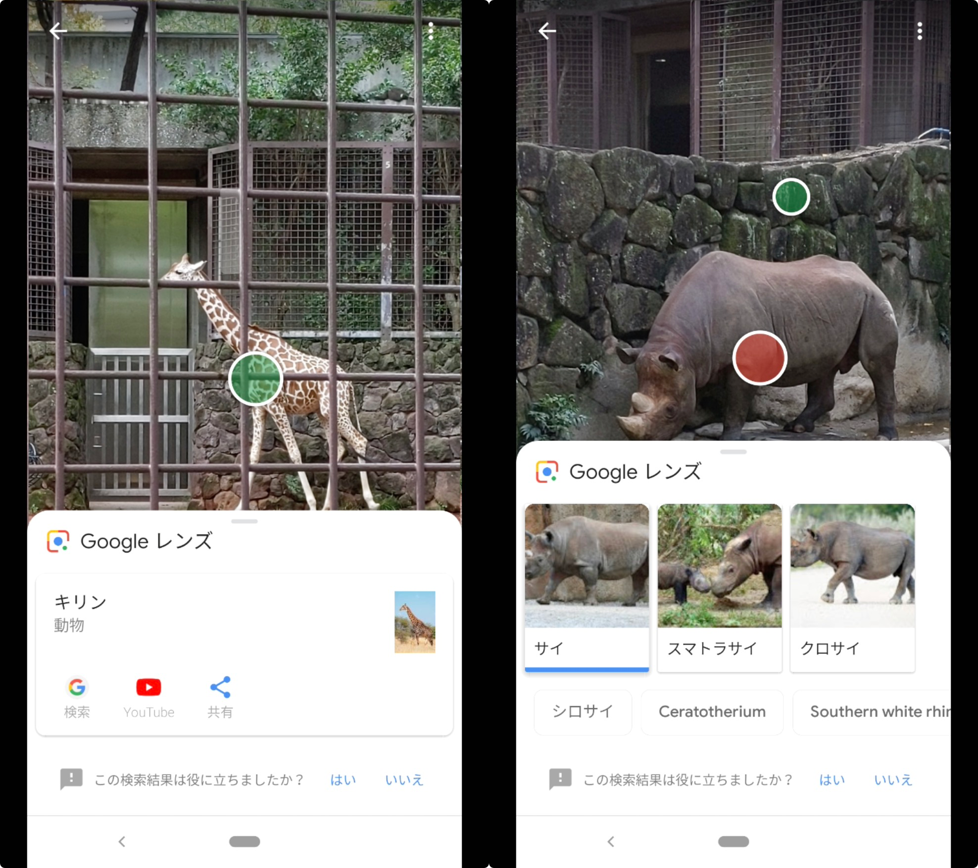 いろいろな動物をスキャンした結果、「キリン」とか「サイ」といったおおまかな種類は高精度で教えてくれます。