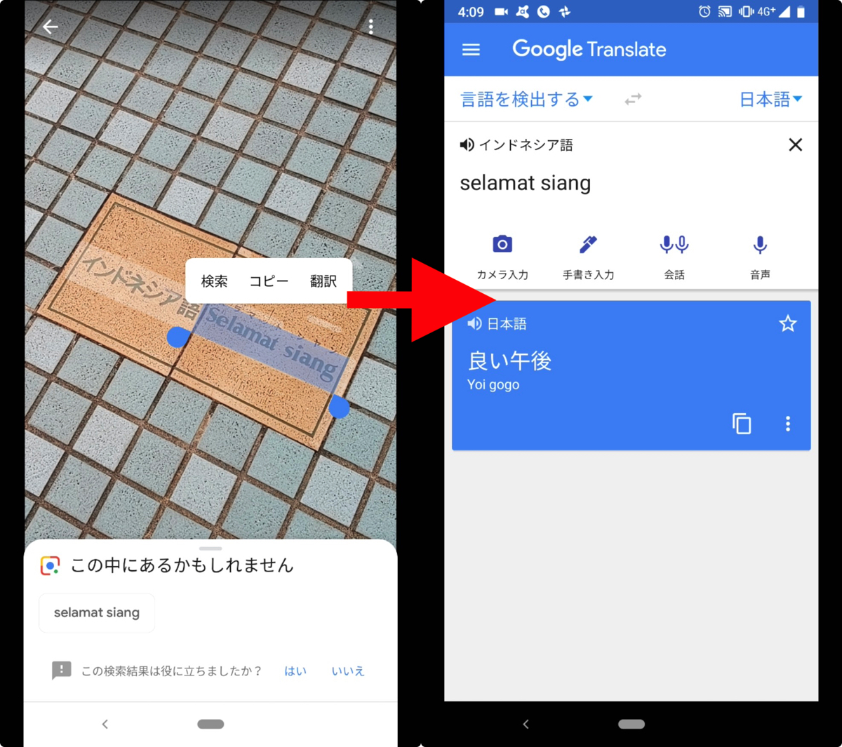 さらに、路面に書かれた外国語にカメラを向けてみると、Google翻訳で意味を知ることもできました。多分、「こんにちは」的なことであることは理解。