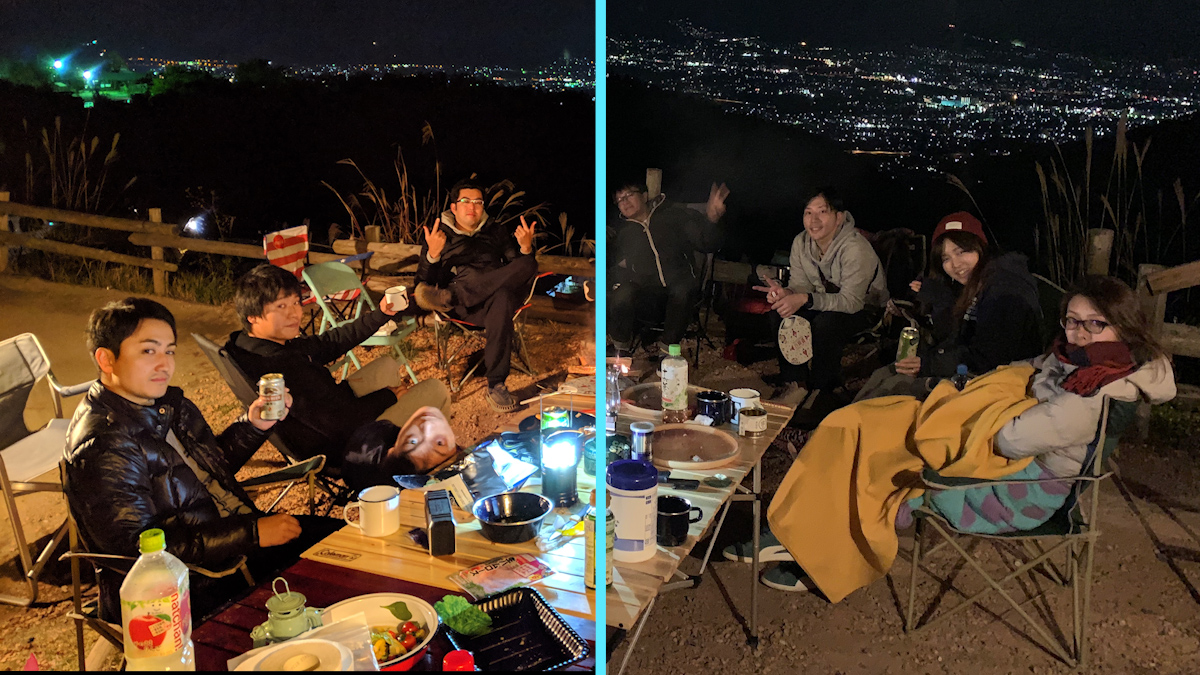 真っ暗なキャンプ場。Pixel 3は人の顔がしっかりと認識できているため、加工なしでSNSにも載せられそう。