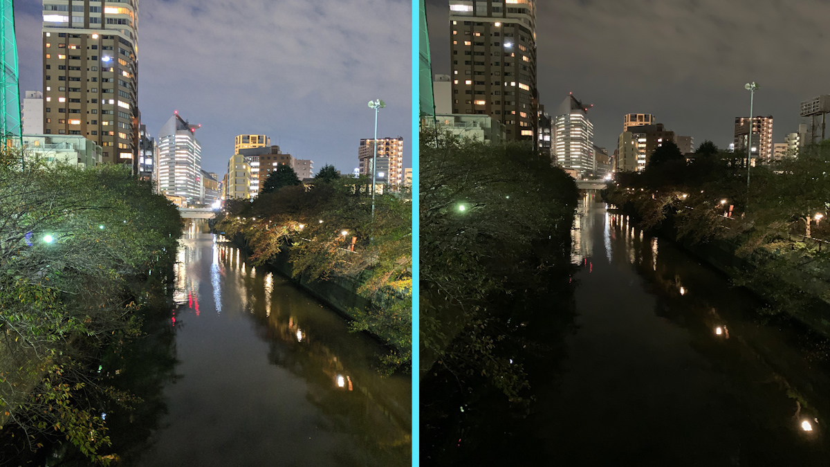 まずは夜の川辺をメインに、街を撮影した写真がこちら。iPhone XSに比べて明るく写っていますが、夜景などがとてもキレイに写っています。