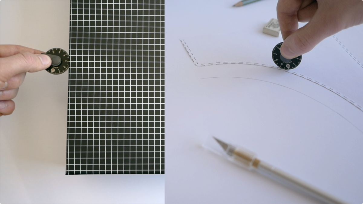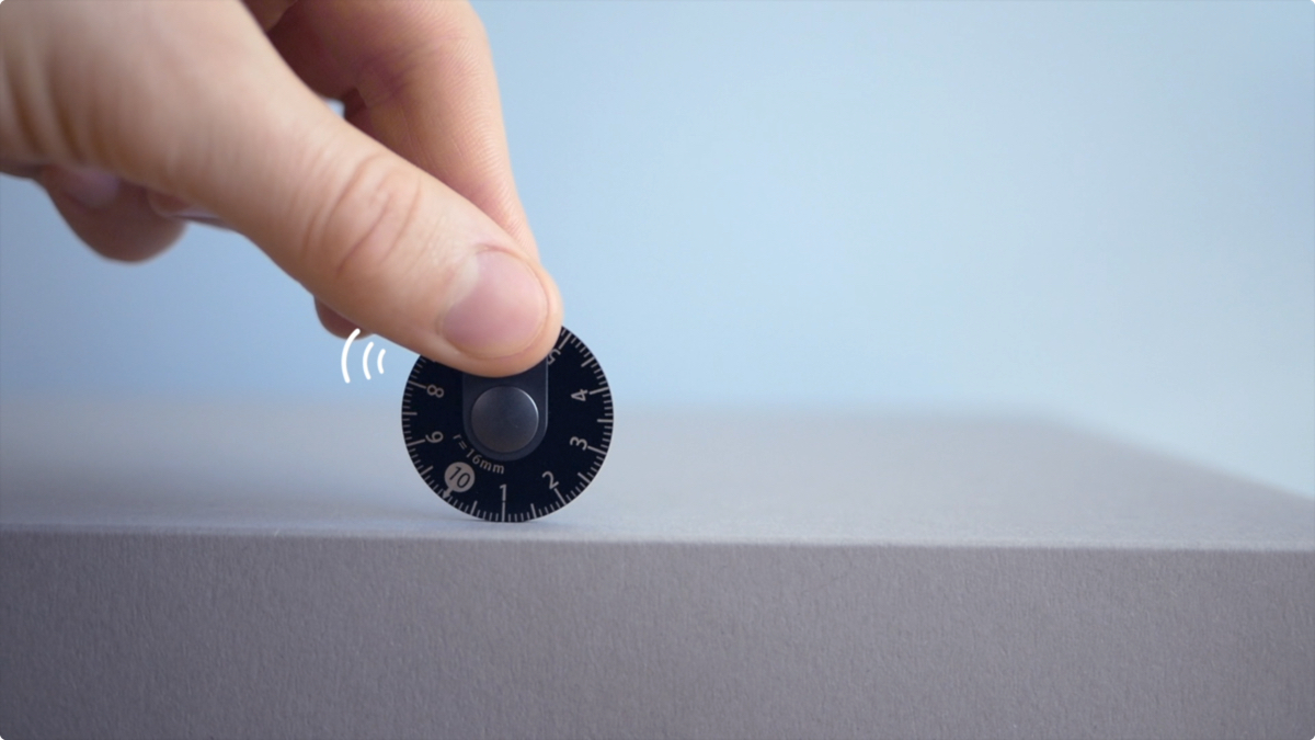 10cmモデル、20cmモデルなど、異なる直径のモデルから選択可能。「スタートポイント」からちょうど1周回るとカチッと音が鳴る仕組みで、1周ごとに鳴る音で聴覚的に長さを計測できる。1cm〜9cmの細かい数値は視覚的に数えるという、シンプルながら特殊なメジャーとなっている。