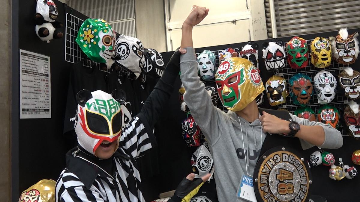 異色を放つプロレスマスクを販売する人たち。チャンピオンの気分になれます。48回目デザフェス記念仕様のマスクと共に1枚、ありがとうございました!