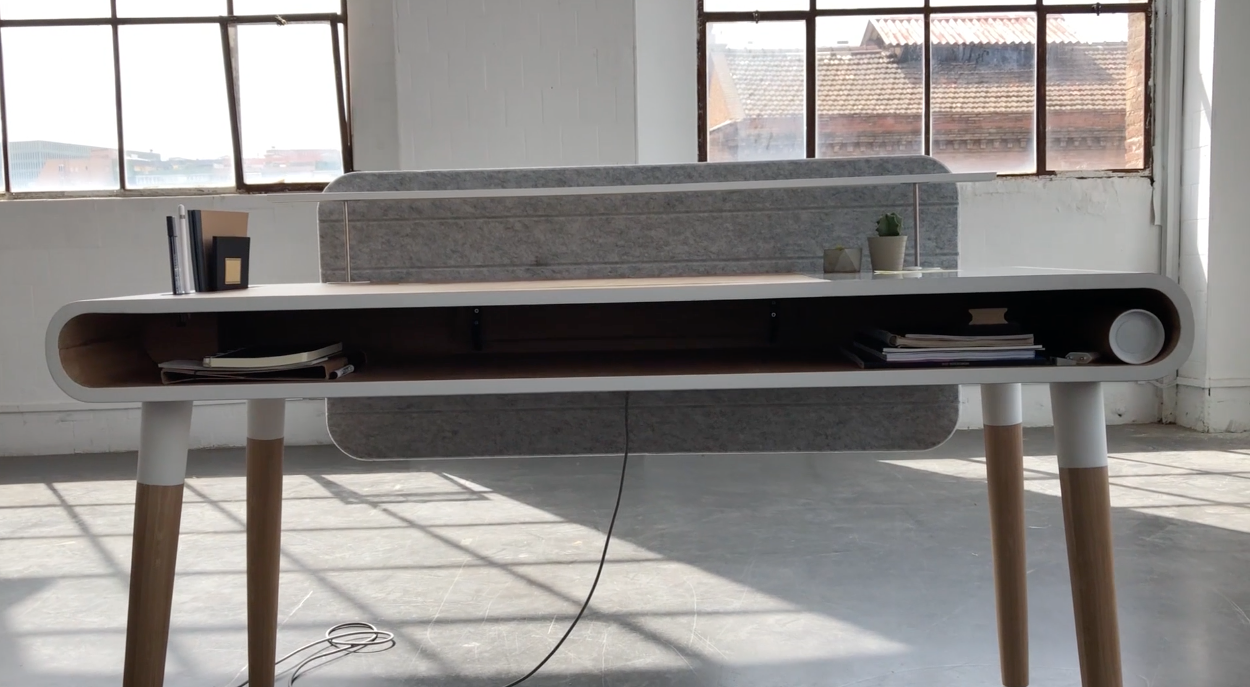 天板にワイヤレス充電パッドやホワイトボード、ペン立て、メモ帳立てなどが配置され、テーブル中にはデバイスを充電するのに便利なUSB端子類を用意。いまどきのデスクワークがはかどる工夫が凝らされている。