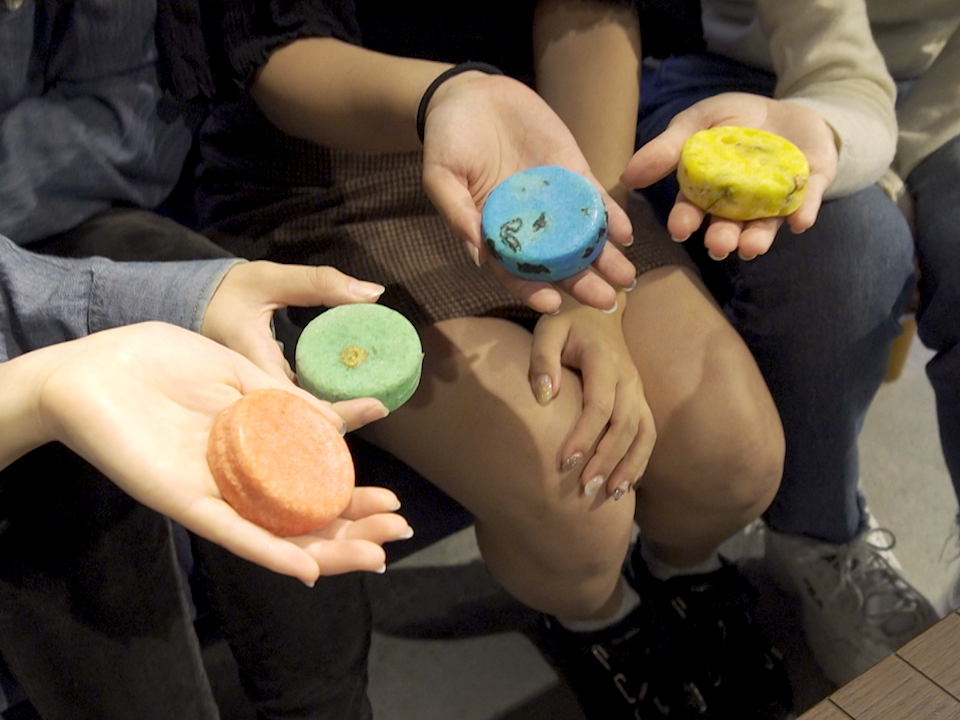 「シャンプーバー」を1個使うとボトルシャンプー約3本分のプラスチック容器を減らせるの。だから、私たち4人がこの「シャンプーバー」を使い続けるだけで、12本分もプラスチック容器を減らせるんだよ! すごいよね。