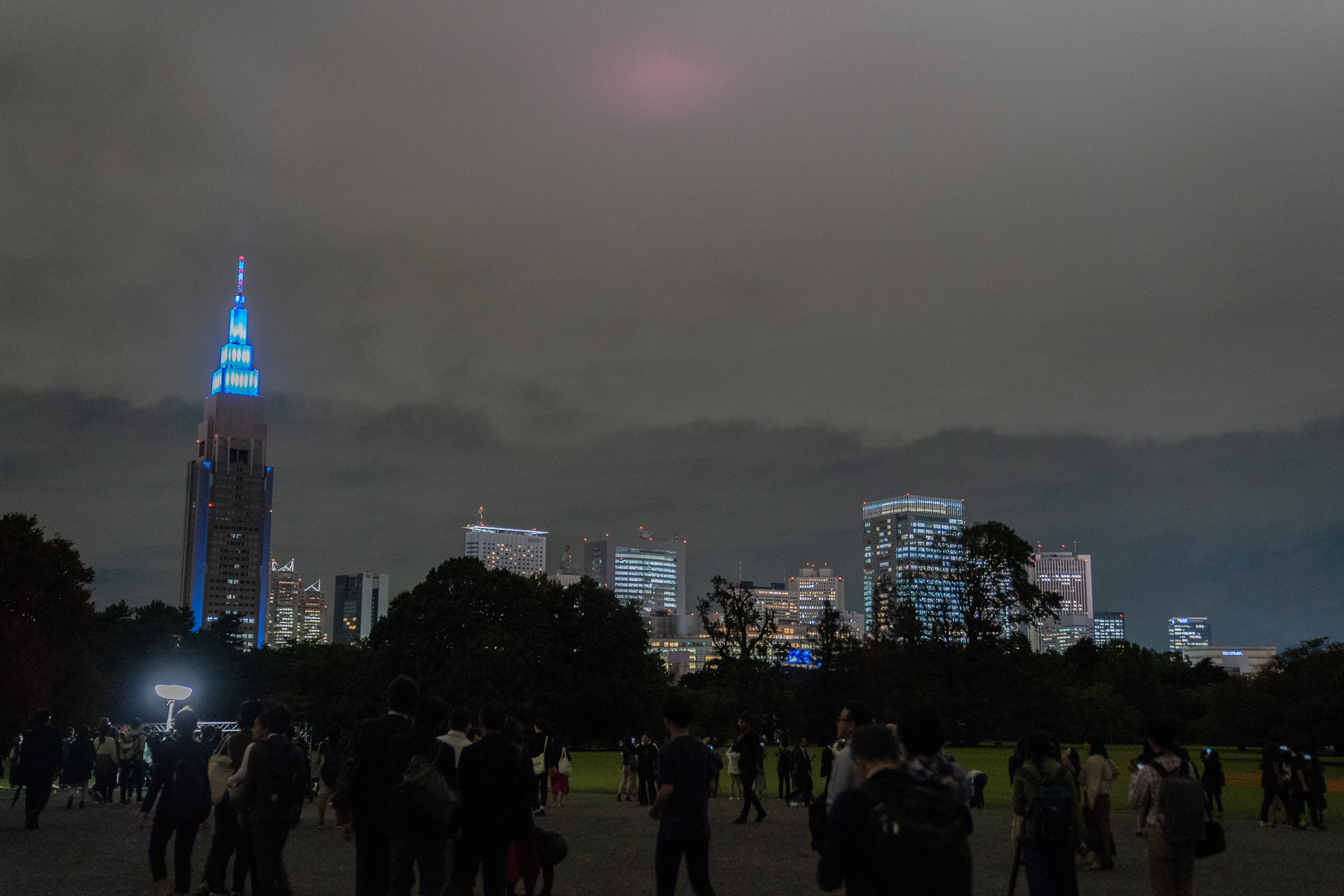 夜歩はイギリス式風景庭園前からスタート。新宿の摩天楼がひときわ存在感を放っていました。