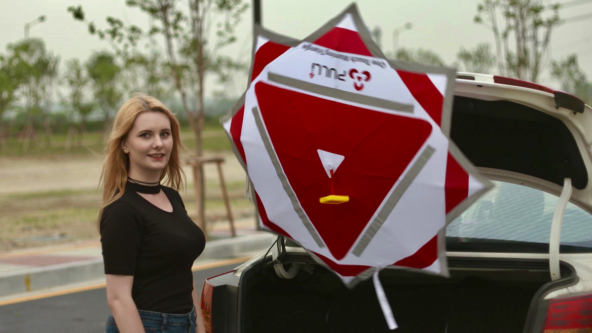 傘には360°回転、上下左右に動くチルト機能が搭載されており、強風にも耐えられる設計。実験では、正面、側面、背面、任意の方向から風速16メートルの風が吹いても、自動車から飛んでいかないほどだ。